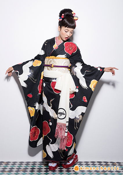 紅梅黄梅に鶴が舞う振袖に、シルバーの帯がなんとも粋な組み合わせ。同じ鶴をあしらった白いしごきで、人とは違う私を演出。