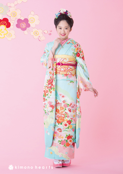 柔らかな水色に、ころころとした菊が愛らしい。帯の熨斗柄と帯締めの濃いめピンクで甘酸っぱく仕上げて。