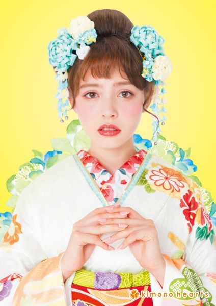 淡いピンクに可憐な花柄。真っ赤な帯で愛らしくまとめて。