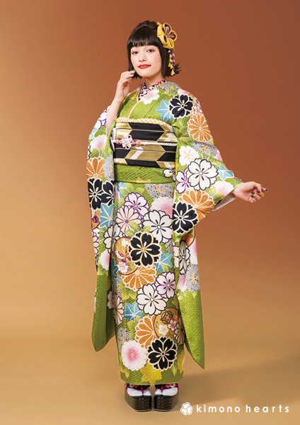 淡い緑を印象づける黒い花。帯にも黒を取り入れて、個性的な愛らしさを引き立てて。