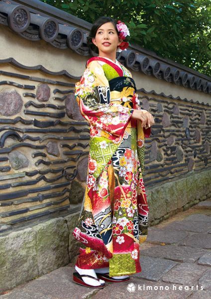 和の心を感じる赤と緑の振袖。黒を取り入れることで大人の女性らしい装いに。