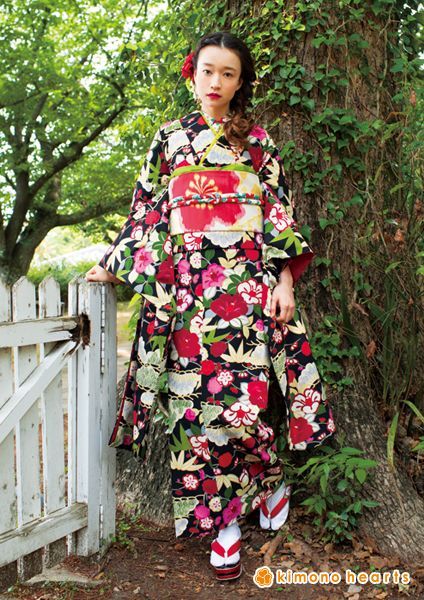 黒地に咲く松竹梅がなんともノスタルジック。絣調の帯と、椿柄のまるぐけ帯締めでアンティークを演出。 紅白の小物を合わせると、さらにハレの日にピッタリのコーデに! レトロモダンな雰囲気にすることもできます。