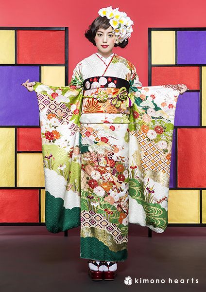 白と緑の流れるような雲取柄に、沢山のお花が入ったお振袖。大きくない柄なので身長関係なく古典柄が映えるのと、綸子の生地に七宝柄の地紋が入って華やかさが際立ちます。