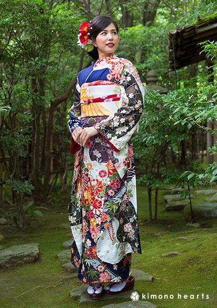 絞りと刺繍をあしらった豪華な振袖。紺地に流れる桜が美しい。