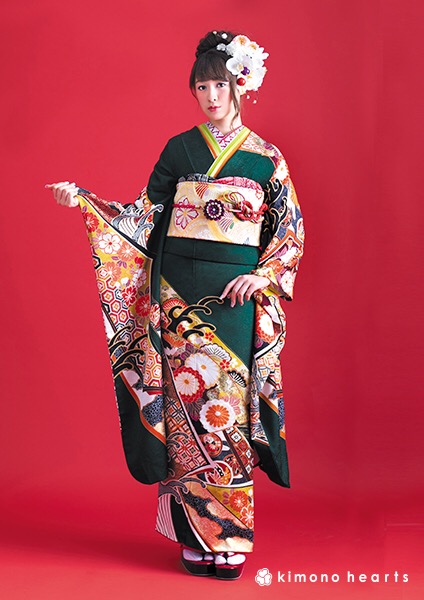 深緑に熨斗目が美しい、金箔が施された金彩振袖。襟元も豪華に着飾って。