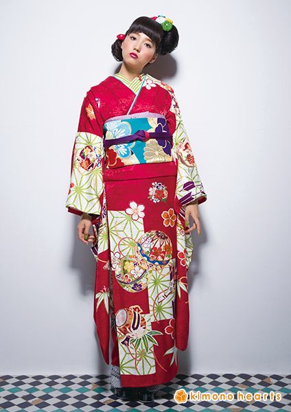 紅白に緑の麻の葉、散らばる鞠や小槌。水色の帯に紫の帯締、赤や黄色、緑の髪飾りでカラフルにおめかしを楽しんで。