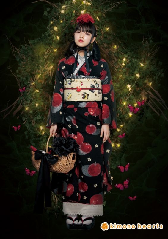 黒地に、赤ずきんちゃんを思い出すような、珍しいりんご柄のゴシックお振袖。よく見ると生地にも水玉の地模様が入っており光が当たると水玉が浮かび上がってお洒落を演出してくれます。 ゴシックにも、可愛くもできるキモノハーツオリジナル振袖です。