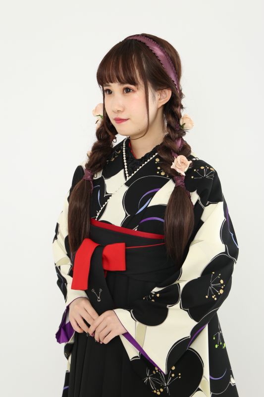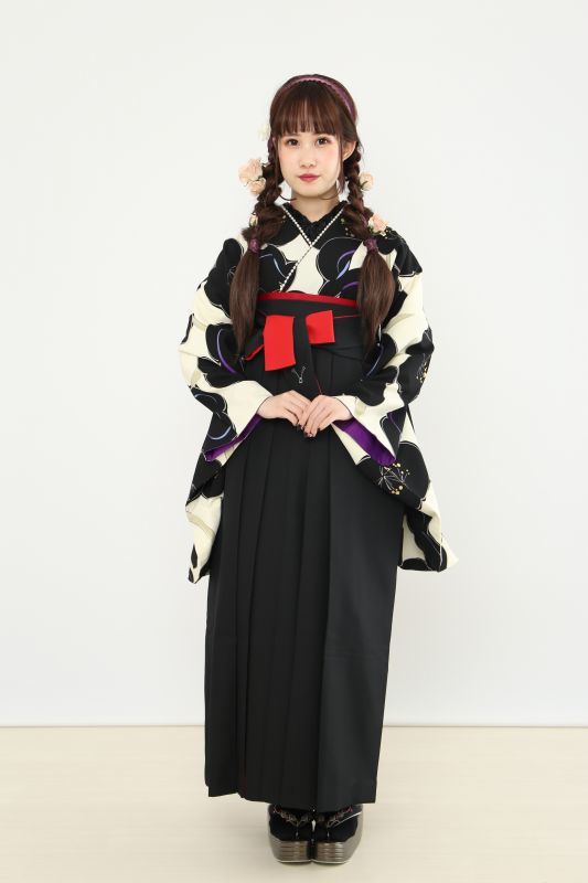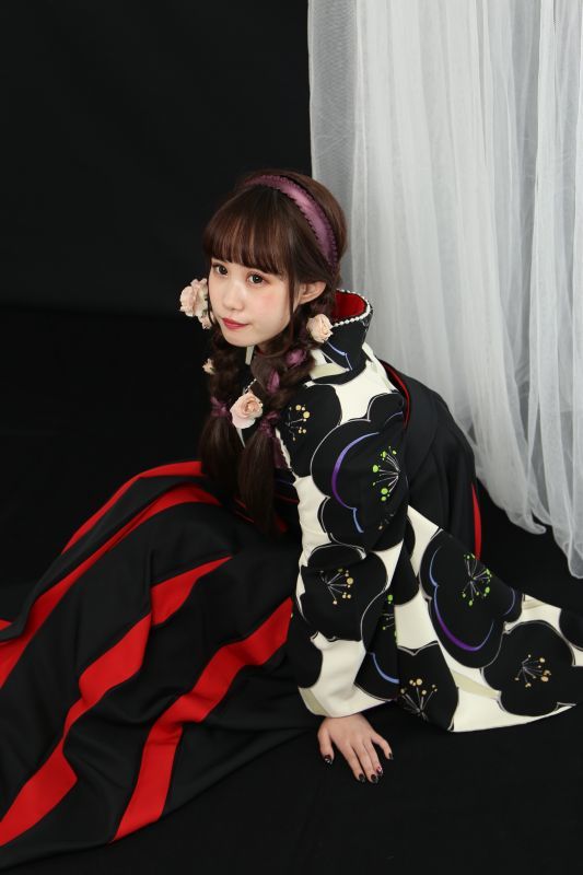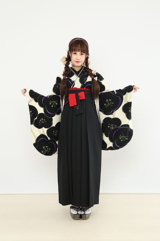 オフホワイトに大きな黒い梅に黒い袴でゴシックな雰囲気に。袴のプリーツ地に赤色が入っており、