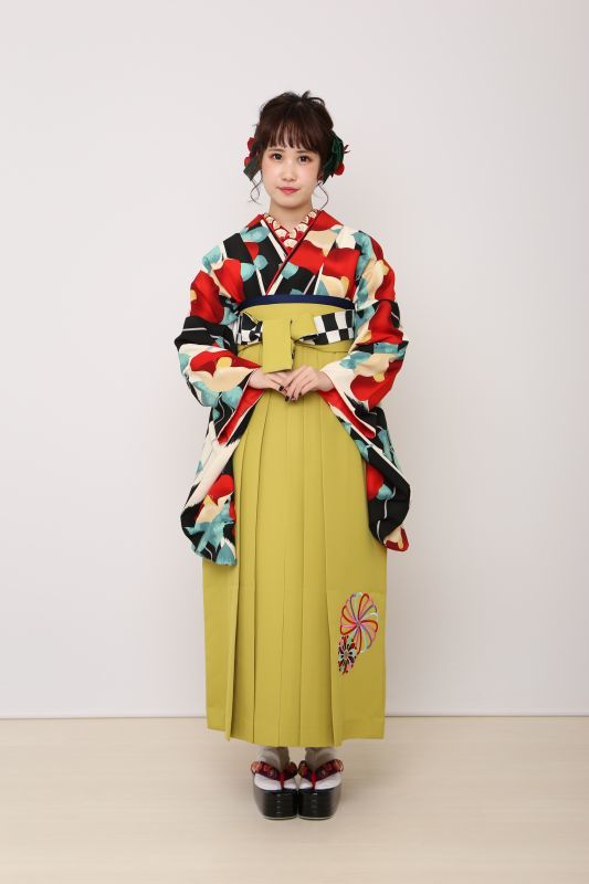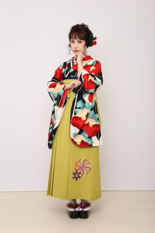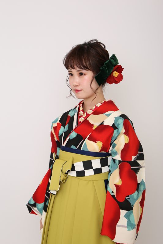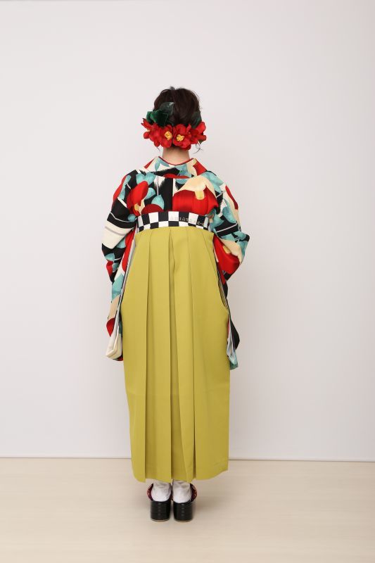 黒地に大きな椿づくしの二尺袖に、AMIAYAブランドのライム色の袴。 ねじり梅のカラフルな刺繍や、お紐の市松模様が個性的。 人と違った一枚です。