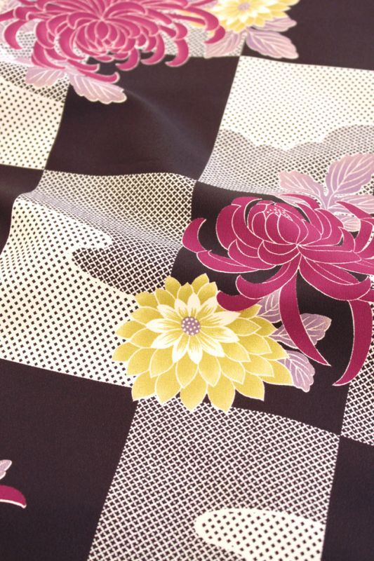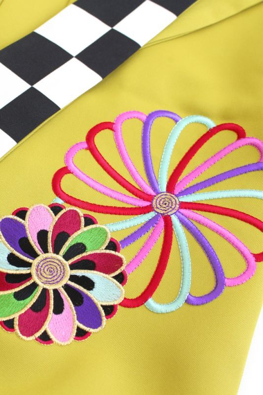 こげ茶×白の市松模様の二尺袖(小振袖)と黄緑の刺繍入り袴のセット。必要なものが全て揃った安心のフルセットです。