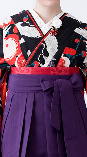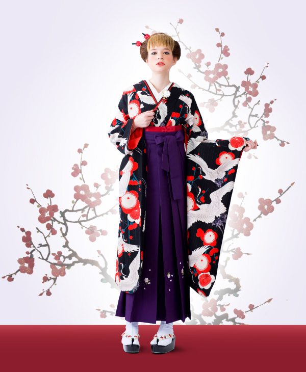 アンティーク風の鶴の柄が印象的。黒と赤のコントラストが綺麗な振袖に、桜の刺繍の袴を合わせました。