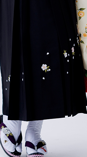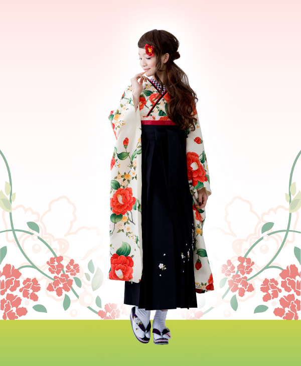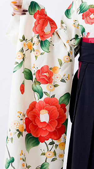 可憐な乙女椿がデザインされた振袖。アイボリーで優しく清楚なイメージに仕上がります。袴は桜の刺繍で引き締めて。