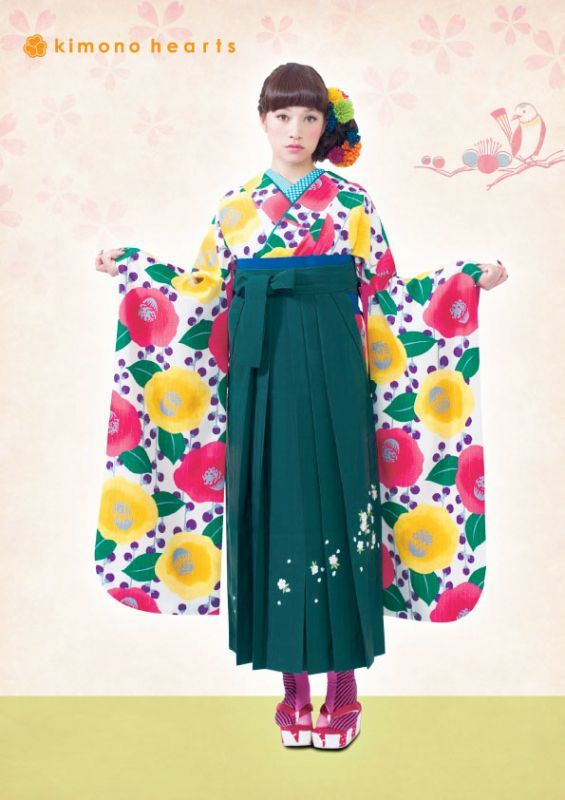 ショッキングピンクとイエローの配色がポップでキュート。白ベースでお顔移りが良く、春卒業シーズンにぴったりの1枚です。袴はグリーンを合わせて爽やかに。