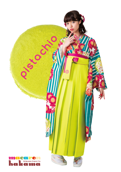 ビビッドなターコイズブルーのストライプに蛍光のピスタチオカラーの袴でとびきり華やかなレトロコーデ