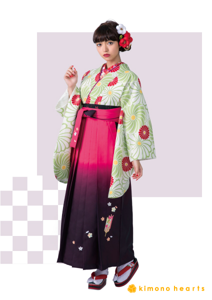 若草色の万寿菊柄の二尺袖と袴はローズ色のグラデーションに矢羽の柄。 落ち着いた色の組み合わせは卒業式にぴったり。