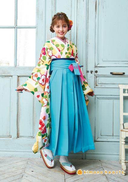 クリーム地に黄色の太いストライプ柄、さらにコロコロした椿が可愛いレトロモダンなお振袖に 袴は珍しいラムネ色に、お紐はショッキングピンクの個性的な袴。 キモノハーツオリジナルのマカロン袴で他と差をつけれます