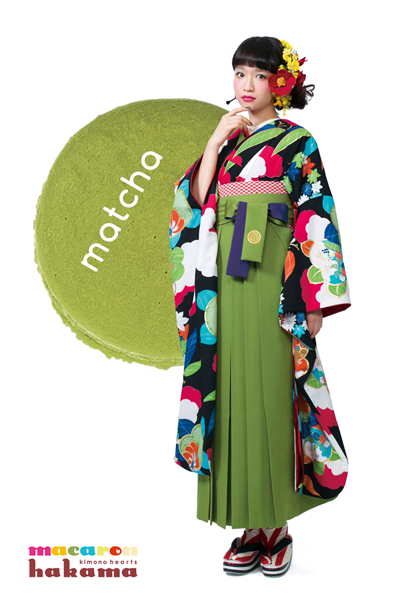 黒地にたくさんの色が入ったレトロなお振袖袴はキモノハーツオリジナルの抹茶色を合わせて渋さをプラス。